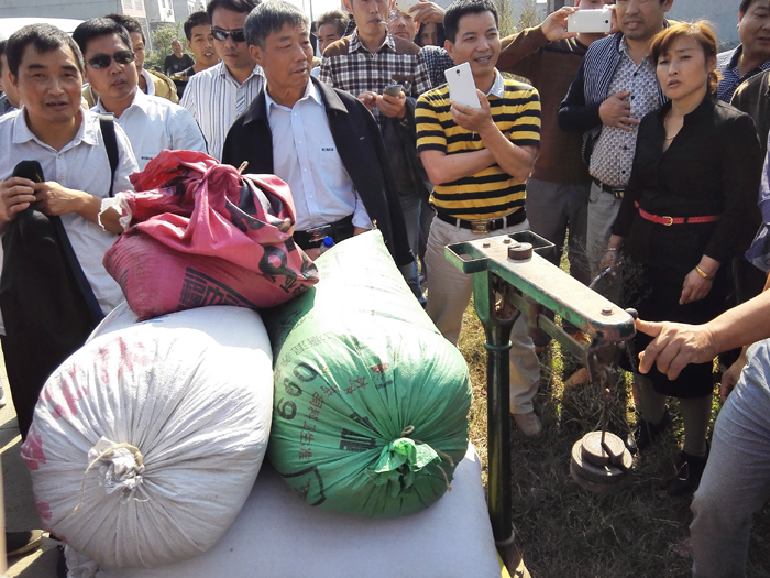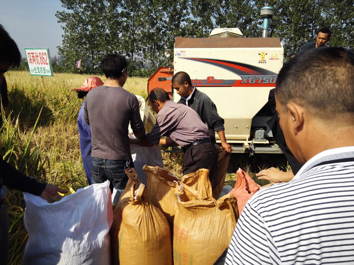 收割測產工作于12日10點整開始。潛江、天門、仙桃、洪湖、監利、京山、石首、公安每個地區選出一名代表參與測產。實測面積201平米,收獲7袋谷共計518斤(每平米2.577斤),折合畝產2577斤(一千平方計算)。