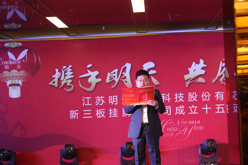 2016年2月2日晚,值此江蘇明天種業科技股份有限公司新三板掛牌之際,公司在紫金生態園隆重舉行江蘇明天種業科技股份有限公司新三板掛牌暨成立十五周年慶典活動。江蘇省農科院、南京農業大學、江蘇省科技廳、江蘇省農委相關領導及公司合作伙伴、老員工代表和全體員工共計350人參加了此次活動。