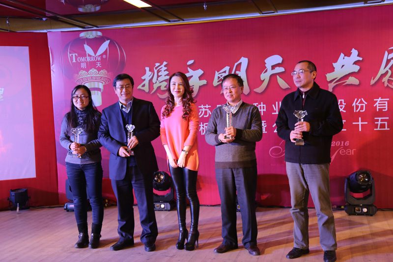 江蘇明天種業于2001年由江蘇省農科院創辦,15年來,明天種業的發展,得益于各級領導的大力支持,得益于公司員工的辛勤努力,得益于新老客戶的垂青厚愛!慶典活動上,公司對15年來,一直與我公司攜手同行,經歷過荊棘與坎坷,也一起分享成績與榮耀,一直不離不棄的四家單位:羅山明天種業、江蘇省聯豐種業、江蘇姜豐種業、宣城市宣種種業有限責任公司頒發了“守護之星”獎杯,感謝他們對明天種業一如既往的支持;對安徽省壽陽種業、羅山明天種業、宿遷金田種業、阜南縣豐悅種業服務中心、宣城市宣種種業、江蘇姜豐種業、泗洪縣雙豐種業有限公司、江蘇省聯豐種業、海門市興安種子經營部、亳州市種子公司、新洋農業試驗站、高郵珠湖種業、江蘇金色農業、南京神州種業、建寧縣裕信種子專業合作社等十五家誠實守信、合作共贏的合作伙伴頒發了“明天之星”獎杯;對明天種業十五年來做出杰出貢獻的王才林研究員、盛生蘭研究員、馬鴻翔研究員、顧正中研究員等五位專家頒發了“特別貢獻獎”;對金楊、楊地龍、徐江、王波、楊海波等五位工作滿十三年以上的老員工頒發了“奉獻獎”。