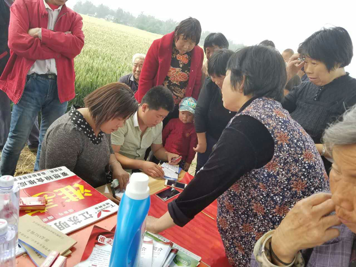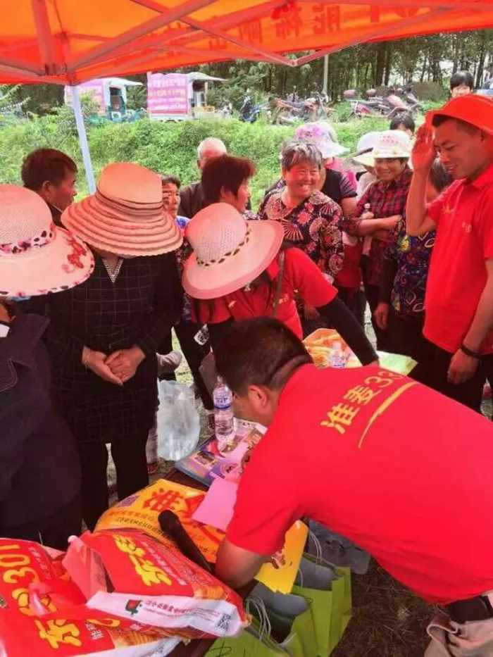 5月7日,在臨泉新農耕服務公司總經理韋創偉的帶領下,臨泉縣張營鎮鄉鎮農資經銷商劉人杰召開了臨泉首場淮麥33農民觀摩訂購會。會議開始,臨泉新農耕服務公司組織農戶進行田間觀摩并講解,淮麥33根系發達,分蘗力強,莖稈粗壯柔韌性好,籽粒飽滿,長相清秀等特點征服了在場農戶的眼球,觀摩后農戶紛紛掏錢進行現場預定,現場到會24人,成功預定4680斤淮麥33種子,開辟小麥種預定銷售的先河,韋總表示,接下來會召開了100場農民預定會,實現100萬斤預定銷量。安徽懷遠雙橋鎮實現單場農民會訂購數量3萬多斤;安徽淮北連續三天召開近10場會議,預定量達10萬斤;泗縣更是遍地開花,逐個鄉鎮召開預定會,將種子銷售在田間地頭進行。