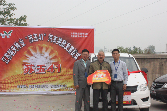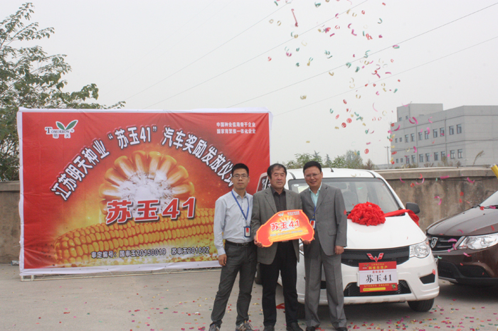 金秋十月正桂花飄香的季節,也是收獲的季節。江蘇明天種業于10月12日在江蘇徐州市組織召開“蘇玉41”汽車獎勵發放儀式。公司為感謝廣大經銷商在蘇玉41品種推廣上所做的貢獻,特制訂“蘇玉41”車輛獎勵政策。經過長達1年的辛苦努力推廣,其中徐州市、沛縣、豐縣、濱海縣、淮安市、泰州市、海門市、盱眙縣8家蘇玉41經銷商達到了政策獎勵的要求。通過此次活動對這8個地區的經銷商進行汽車獎勵。