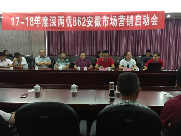 7月22-23日, 2017-2018年度“深兩優862”安徽市場營銷啟動會在安徽省合肥市拉開序幕。公司總經理助理蔣銀濤、雜交水稻部經理楊海波、雜交水稻部安徽辦事處負責人趙龍出席本次市場營銷啟動會。會議由皖東片區經理黃新主持,來自合肥等17個地級市的合作伙伴30多人參會。本次大會旨在傳遞“明天是希望、明天更是承諾”的理念以及在新一輪品種井噴式爆發下,安徽市場深兩優862營銷模式該如何著眼未來,改變傳統的思維模式和運作方式,適應新的挑戰。