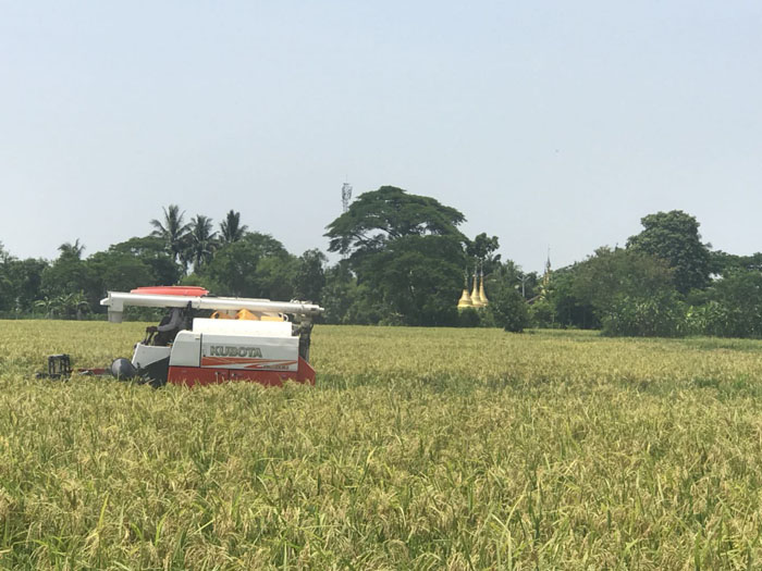盡管當天緬甸實時氣溫高達38℃,但依然無法阻擋大家現場參觀緬甸合資公司生產基地的熱情。正值當地水稻旱季制種收獲季節,在基地工作人員的帶領下,大家興致勃勃地一起觀摩了機械化收獲雜交水稻種子。看到一臺臺收割機在隨風搖曳生姿的稻田中來回穿梭,然后再將一顆顆金燦燦的種子運輸到倉庫曬場,豐收的喜悅洋溢在在場每一個人的臉上,仿佛看到了這一顆顆滿載希望的種子為緬甸農民帶來更大的豐收,這是一個多么生動美妙的時刻!
