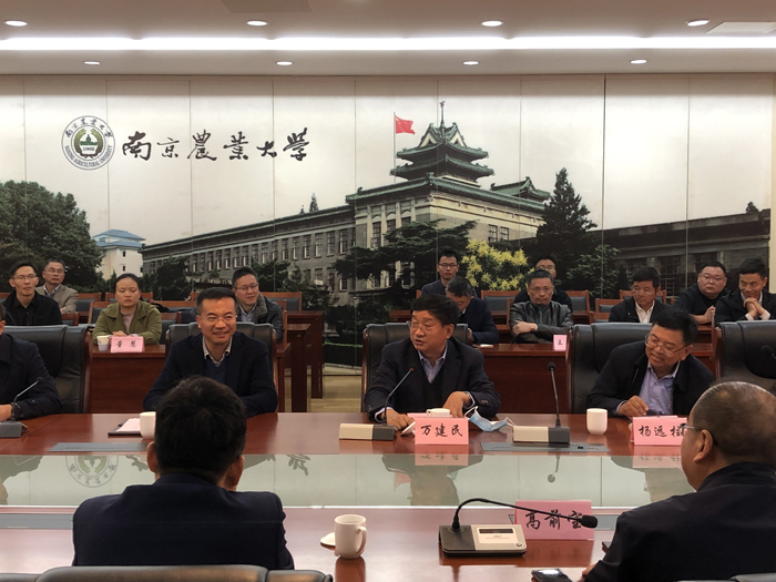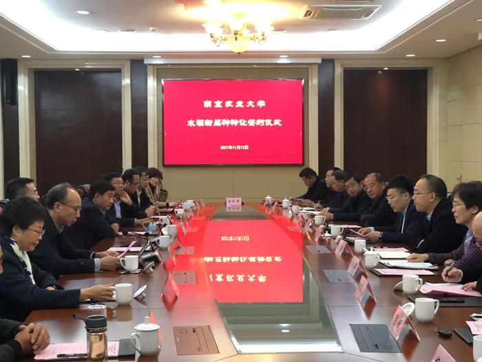 南京農業大學副校長丁艷峰、江蘇省種子管理站站長何金龍、江蘇明天種業總經理嚴輝民、南京農業大學研究院院長姜東、農學院院長朱艷、特約教授盛勝蘭研究員、江蘇明天種業副總經理王波、徐江等相關領導、專家參加了此次簽約活動。